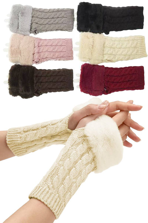 Women's Faux Fur Trim Cable Braided Knitted Fingerless Glove Arm Warmer Sleeve -Fuzzy Faux Fur Cuffed Opening -Assorted Color (2-Black, 2-Brown, 2-...